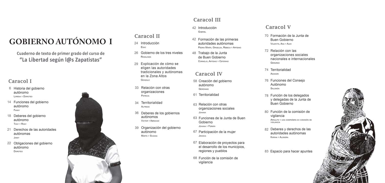 Note: the notebooks with text, which are part of the support material for the course “Freedom according to the Zapatistas,” are the product of the meetings that the Zapatista support bases from all the zones held to evaluate the organization’s work. Tzotzil, Chol, Tzeltal, Tojolabal, Mam, Zoque and mestizo compañeras and compañeros, coming from the communities in resistance of the 5 caracoles, asked each other questions and responded with answers, exchanged their experiences (that are different according to each zone). They criticized, self-criticized, and evaluated how they have advanced and what there is still to do. Those meetings were coordinated by our compañero Subcomandante Insurgente Moisés and were taped, transcribed and worked on for the elaboration of the notebooks with text de.