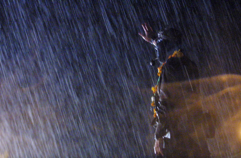 Sup Marcos speaks during a storm in Ixmiquilpan, Hidalgo during the March of the Color of the Earth on February 28, 2001. Photo: La Jornada.