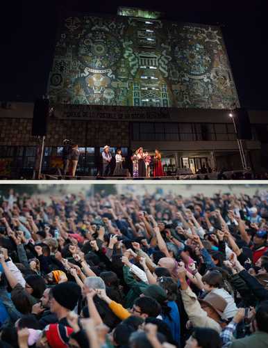 Martín Esparza, of the Mexican Electricians Union; Mario Luna, representative and leader of the Yaqui peoples of Sonora; Araceli Orozco, mother of Lesvy; two UNAM students, Amiel Moreno and Elena González; and Bettina Cruz, an indigenous organizer from Juchitán (Oaxaca) accompanied her on the platform. Botellita de Jerez and Café Tacvba added music and festivities.