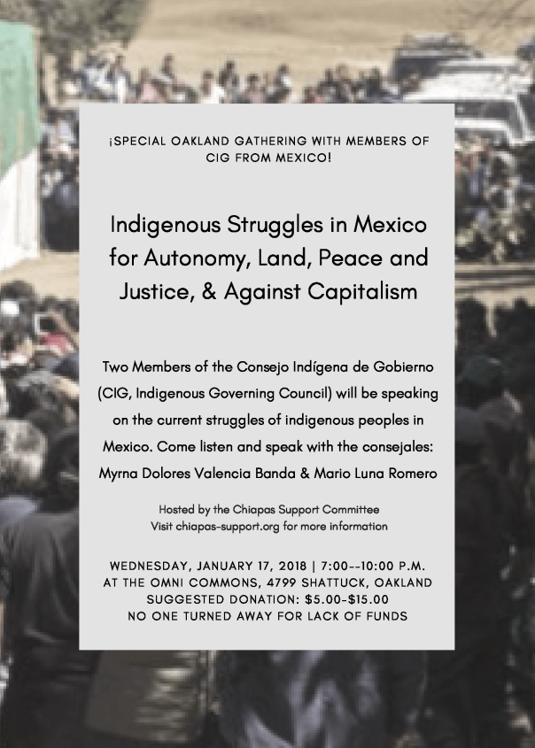 Update: We have just received word that Myrna Dolores cannot accompany Mario Luna on this trip due to some unforeseen conditions in Mexico. Therefore, Mario Luna will speak on behalf of the CNI-CIG at our Wednesday welcoming gathering in Oakland.