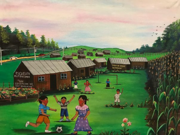 Art from the Zapatista communities. Note the building with a vegetable garden next to it. On the side of the building it says: “autonomous school” and below that: “without education there is no revolution.” A Casa de Salud (House of health) is in the background.