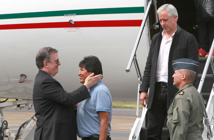 [Mexican] Chancellor Marcelo Ebrard received the ex president of Bolivia, Evo Morales, at the stairs of the Mexican Air Force plane that transported him from Cochabamba. The former Vice President, Alvaro Garcia Linera also appears in the image. Photo: Alfredo Dominguez.