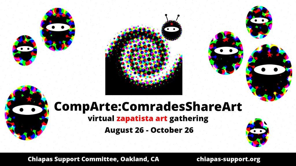 Cada año desde que las y los zapatistas lanzaron el primer CompArte en el 2016, el Comité de Apoyo a Chiapas (CSC, Chiapas Support Committee) ha organizado un encuentro paralelo al CompArte de Chiapas en Oakland. Organizamos nuestro CompArte como un espacio para reunirnos en comunidad y celebrar el arte, música, poesía y los movimientos de la solidaridad con las y los zapatistas y las luchas de los pueblos indios por la justicia.