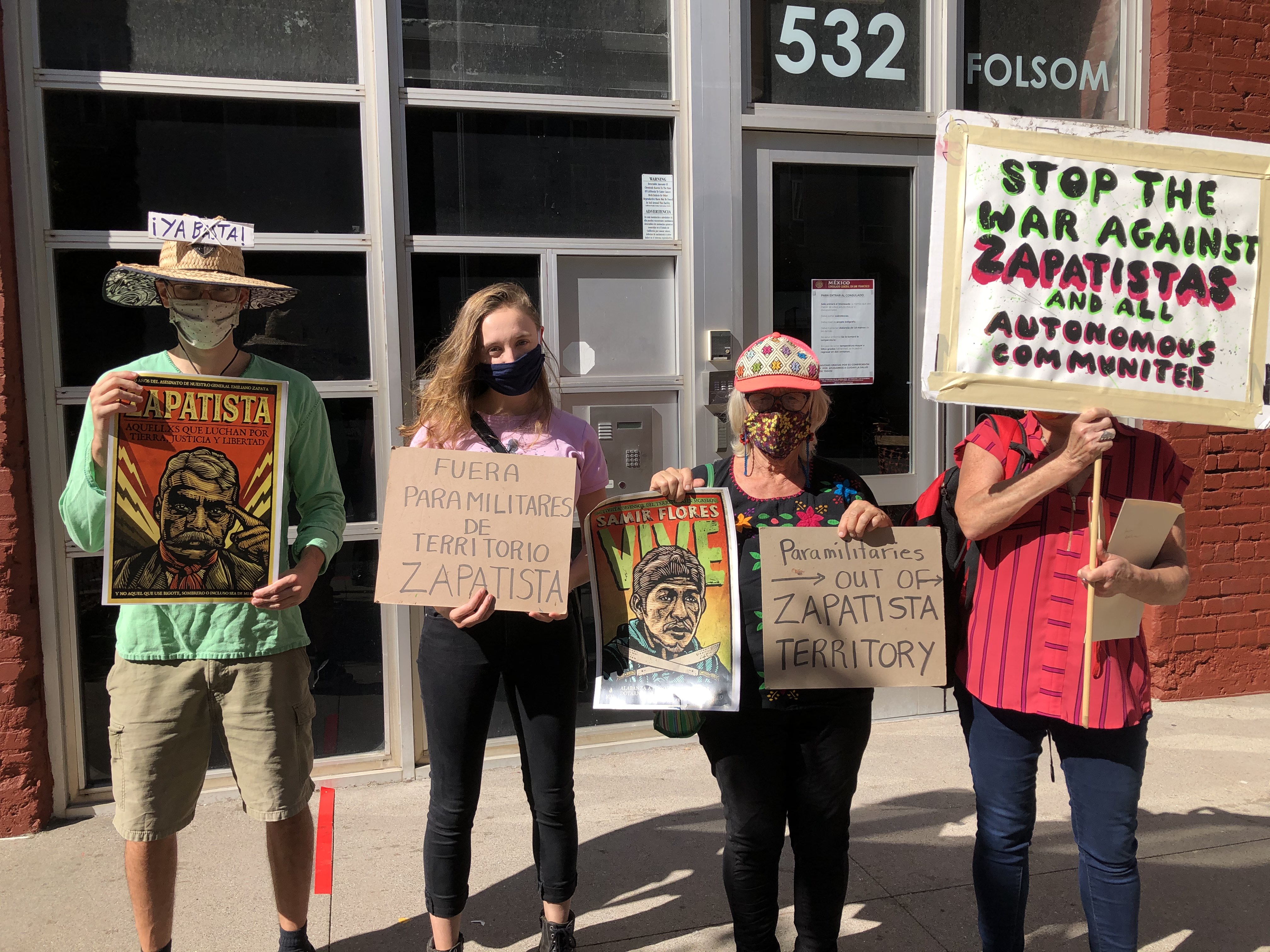 - Organized in June an emergency fundraiser and in September organized an action to support Zapatista and Indigenous communities facing famine and denounced the Mexican government-supported paramilitary attacks, which have resulted in loss of life and pillaging of entire communities. The paramilitary attacks have forced hundreds of Indigenous people to flee for their lives, caused famine, and the attacks have not diminished.