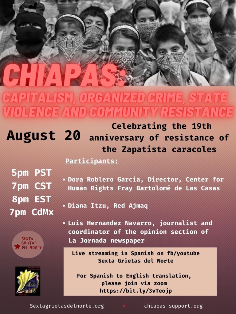 We will celebrate the 19th anniversary of the founding of the Zapatista Caracoles and Good Government Councils (Juntas de buen gobierno) and their extraordinary anti-capitalist, anti-patriarchal and anti-colonial resistance. We will also consider the growing and multidimensional violence of military forces, paramilitary groups and criminal gangs that together are tearing apart the peoples of Chiapas. Violence that accompanies and paves the way for the criminalization of migrant peoples and the penetration of destructive business projects and megaprojects under the false banner of progress and well-being.