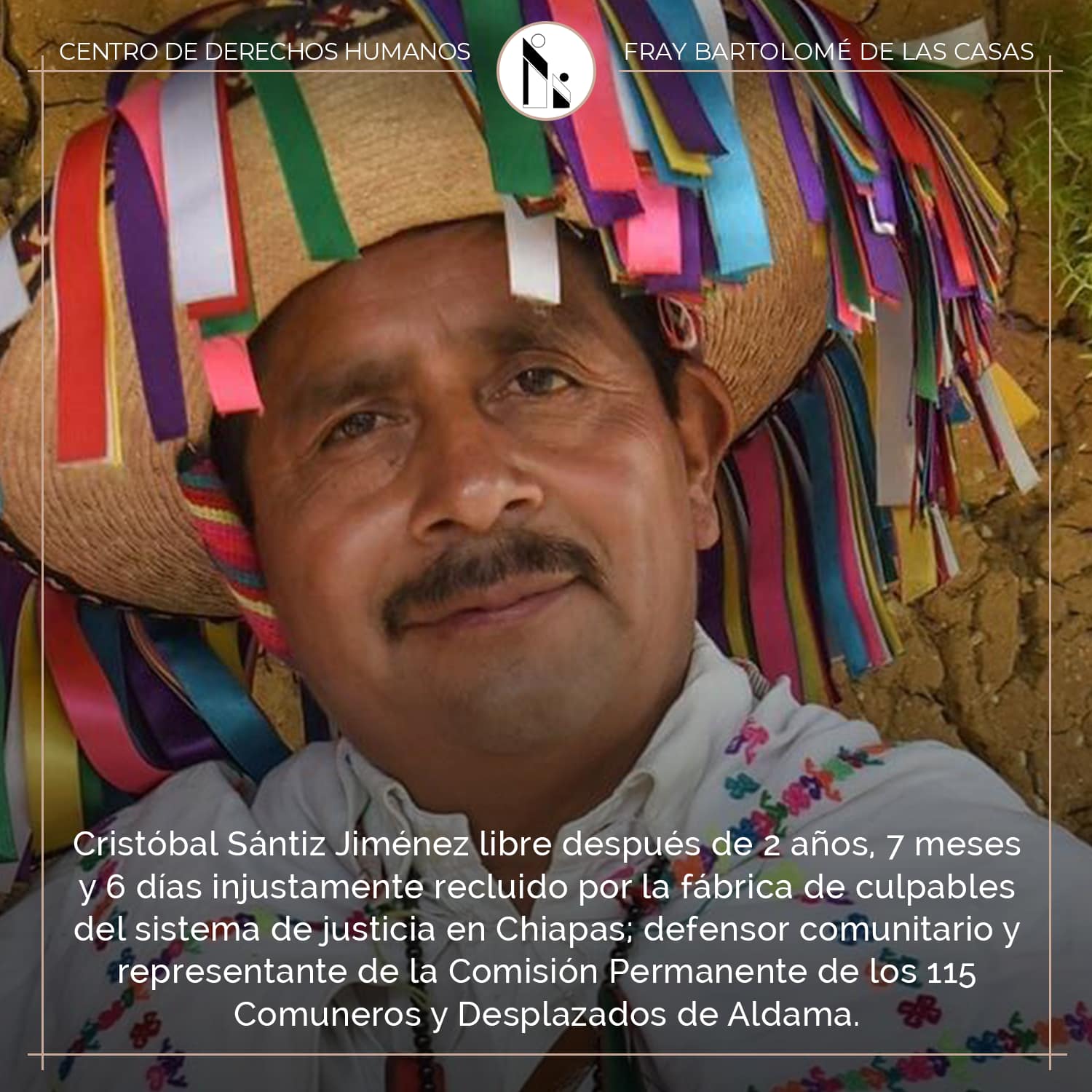 El Centro de Derechos Humanos Fray Bartolomé de Las Casas Human Rights Center (Frayba) announced that after 2 years, 7 months and 6 days, Cristóbal Sántiz Jiménez, Maya Tsotsil, community defender and representative of the Permanent Commission of the 115 Community Members and Displaced of Aldama, was released.