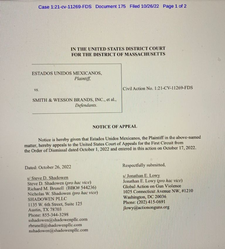 [1] According to a report in Proceso, Mexico’s Secretariat of Foreign Relations filed a notice of appeal with the United States Court of Appeals for the First Circuit in Boston on October 26. And, Mexico also filed a civil lawsuit a few days ago in the Federal District Court in Arizona against 5 arms dealers whom it accuses of knowingly selling high-caliber weapons that will end up in the hands of drug traffickers and organized crime.