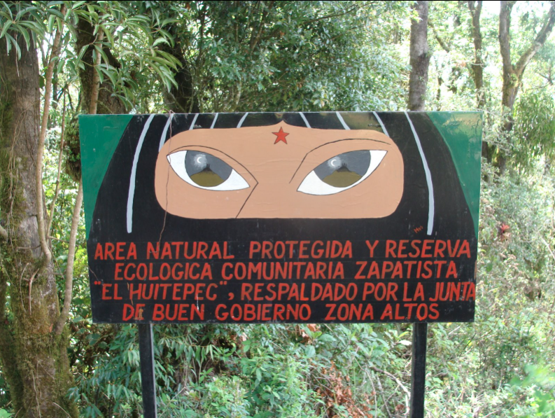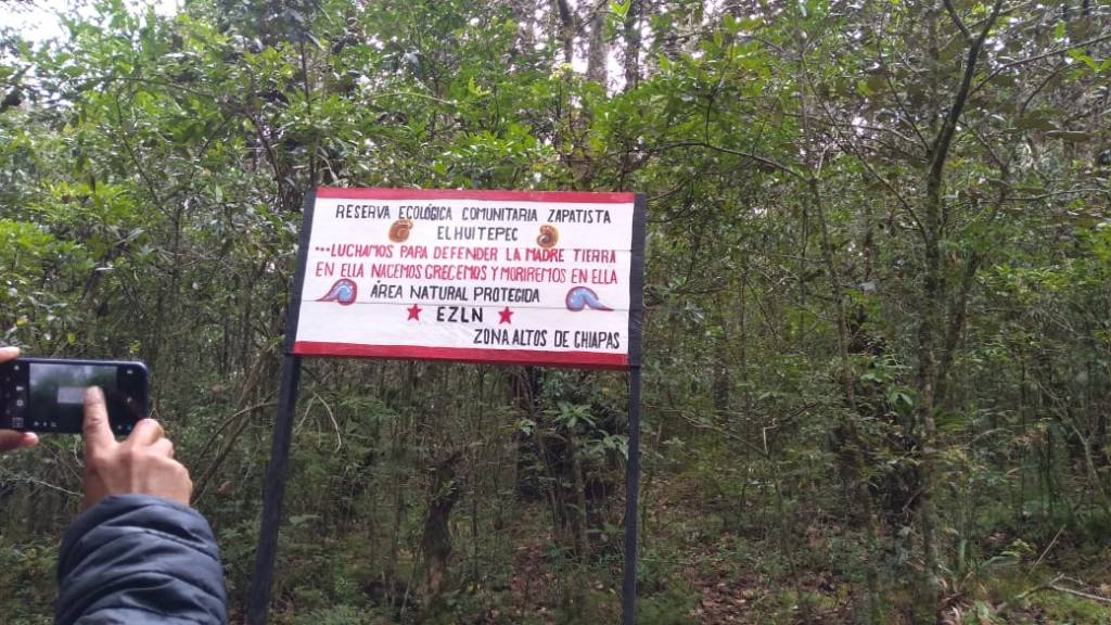 The sign also reads: “We struggle to defend Mother Earth. We are born in her, we grow up and we die in her. Natural protected area. EZLN, Zona Altos de Chiapas (Chiapas Highlands Zone).