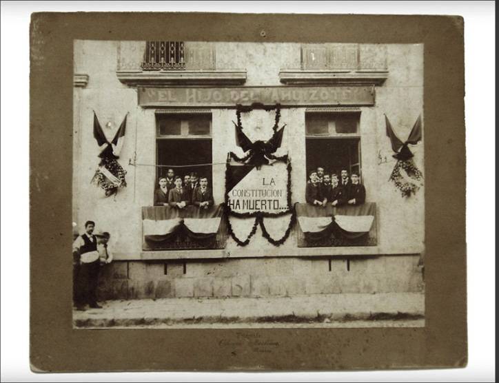 After his release from prison, on April 30, 1902, Flores Magón joined the editorial staff of El Hijo del Ahuizote, a satirical publication loaded with political criticism and an anti-re-electionist theme, which through caricature functioned as a double-edged sword: to both inform and to mock the Porfirian dictatorship. On February 5, 1903, a banner was hung from the offices of El Hijo del Ahuizote with the lettering La Constitución ha muerto (The Constitution has died). In the photograph of the moment appears Ricardo Flores Magón. On April 16, the offices of the publication were seized and its editors, among them Ricardo Flores Magón, were incarcerated.