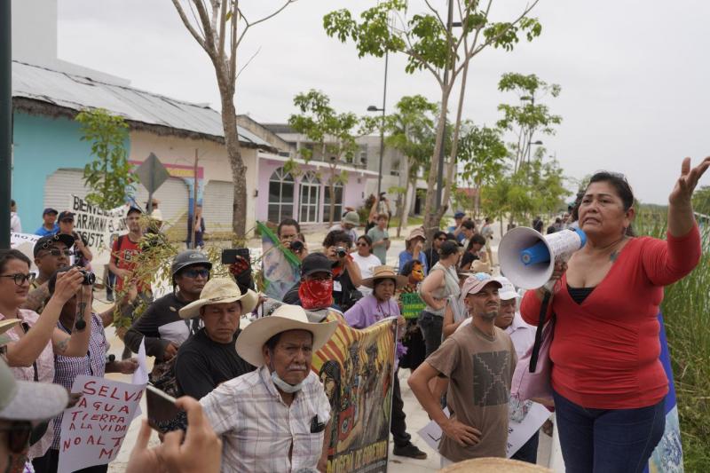 A colleague from the community takes the megaphone and asks us to observe and document the destruction of the river. The death brought by the so-called Maya Train is increasingly notorious in all the places where its construction continues despite multiple protections that have been ignored, thus violating the constitution of the country and the laws that the bad government requires the people to respect, but not the companies.