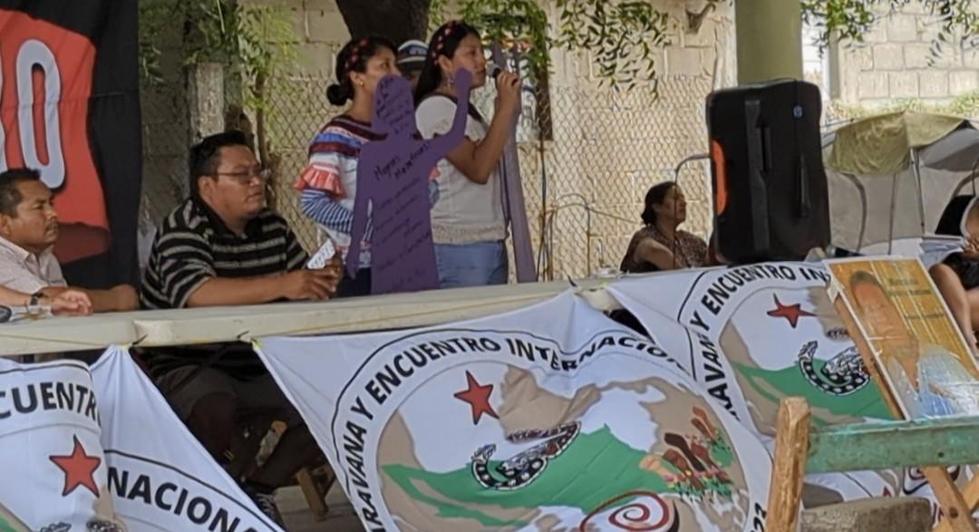 Panel of community speakers at the Puente Madera Oaxaca Foro Político Cultura de Rebeldías y Resistencias held during the El Sur Resiste Caravan (April 2023).
