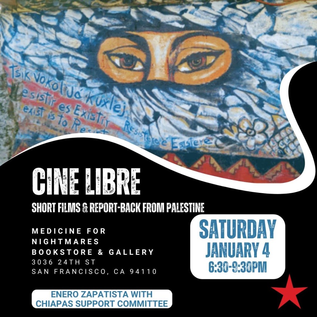 Starting on Saturday, January 4, 2025 (6:30-9:30pm), Enero Zapatista will kick off the month of actitives with “Cine Libre: Short Films & Reportback from Palestine.” featuring a series of short films by Palestinian artists and film-makers that probe the inersections of art, culture and resistance in the mulfaceted struggles facing the Palestinian people under brutal occupation, facing genocide and the seige of Gaza now in its 15th month. A member of the Chiapas Support Committee, who attended as part of a Sexta Grietas del Norte delegation an international gathering in Palestine, will be giving a reportback. Cine Libre will be held at the Medicine for Nighmares Bookstore & Gallery in San Francisco. Click here for more information.