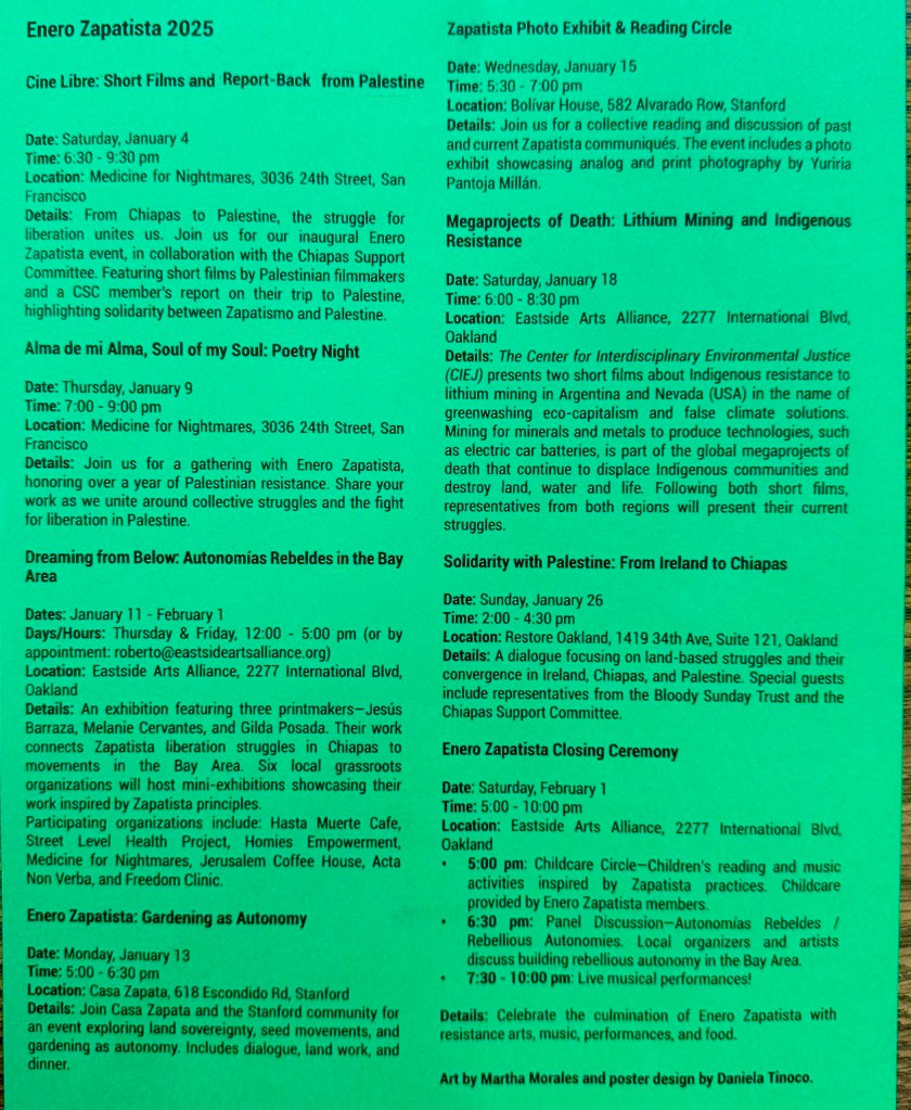 To view the Enero Zapatista 2025 schedule online visit their Instagram blog @enerozapatista.bayarea.