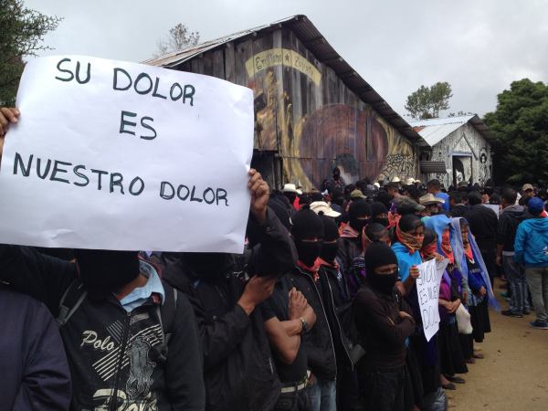 But we know that you know that although Ayotzinapa may go out of style, although the grand plans, strategies, and tactics fail, that although moments of conjuncture go by and other interests and forces come into fashion, that although all those who today hover around you like vultures that thrive on the pain of others, although all of this happens, you know and we know that everywhere there is a pain like ours, a rage like ours, and a determination like ours.