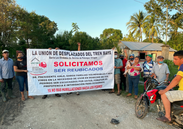 The Union of Those Displaced by the Maya Train protests in Palenque with a banner that asks to be relocated. Photo: Angeles Mariscal